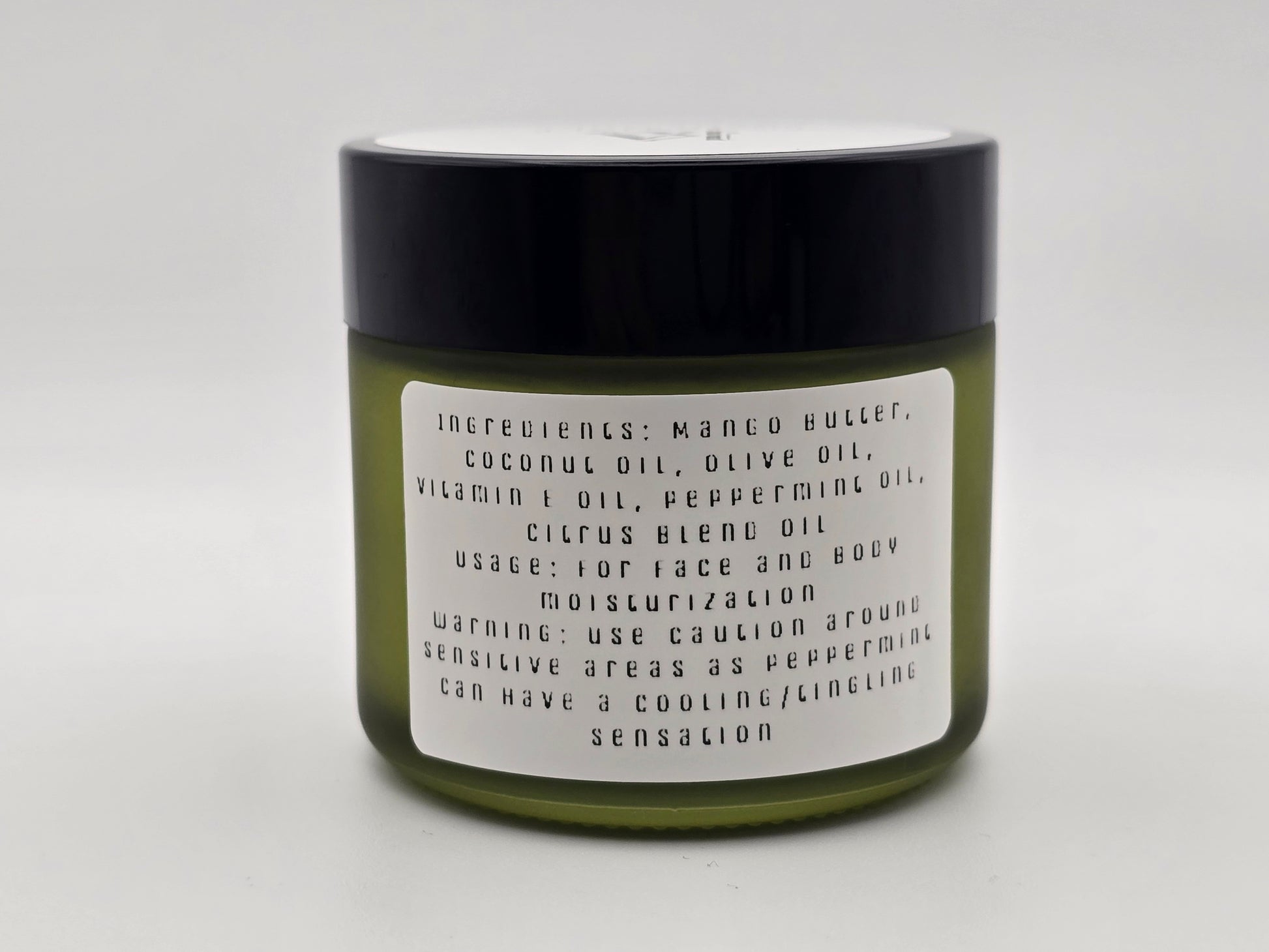 Indulge your skin with our luxurious Body Butter, a decadent blend crafted to nourish and moisturize from head to toe. Infused with rich mango butter, hydrating coconut oil, and pure olive oil, this whipped sensation melts into your skin, leaving it feeling soft and supple. We've added Vitamin E oil for an extra boost of skin-loving goodness, while the invigorating scents of peppermint and palo santo essential oils uplift your senses.